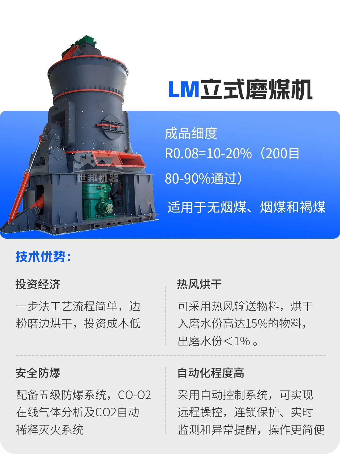 在生石灰煅燒過程中,煤粉質(zhì)量直接影響石灰窯的熱效率與產(chǎn)品質(zhì)量。上海世邦推出的LM立式磨煤機(jī),專為石灰窯配套煤粉制備設(shè)計。