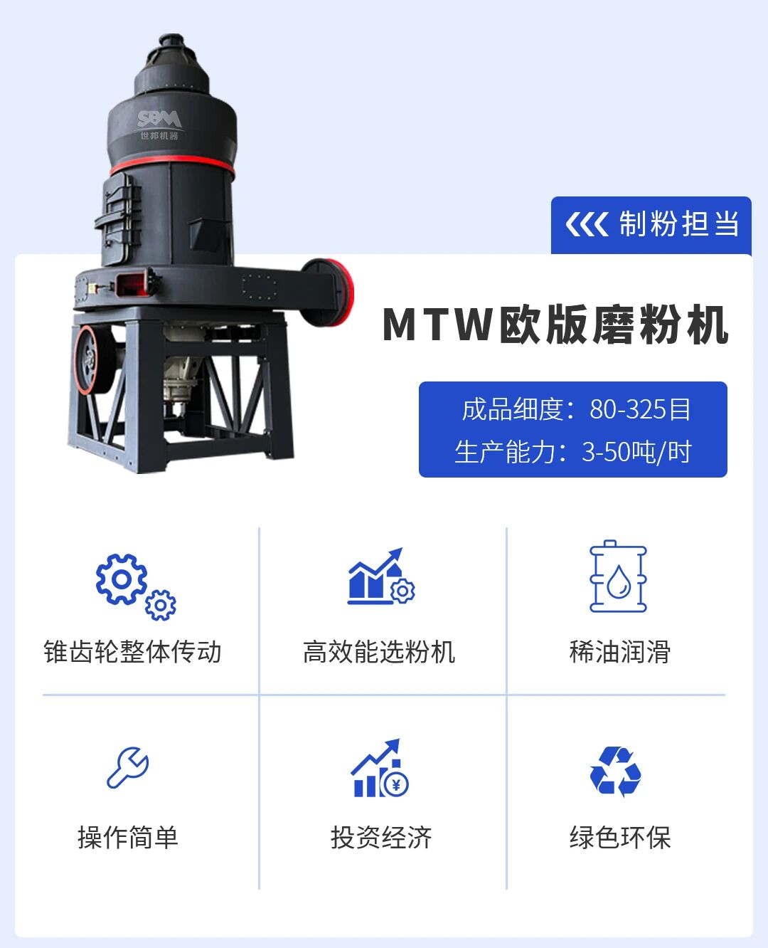 針對井陘石灰石高純度、質(zhì)地均勻的物料特性,以及客戶方對碳酸鈣在細(xì)度(325目)、白度、純度、粒度分布等方面的嚴(yán)苛要求,世邦選用深耕石灰石磨粉場景多年的MTW歐版磨粉機作為核心裝備,其多項技術(shù)優(yōu)勢精準(zhǔn)匹配高值化加工需求,為井陘石灰石打通“優(yōu)質(zhì)資源→高端產(chǎn)品”的轉(zhuǎn)化通道。